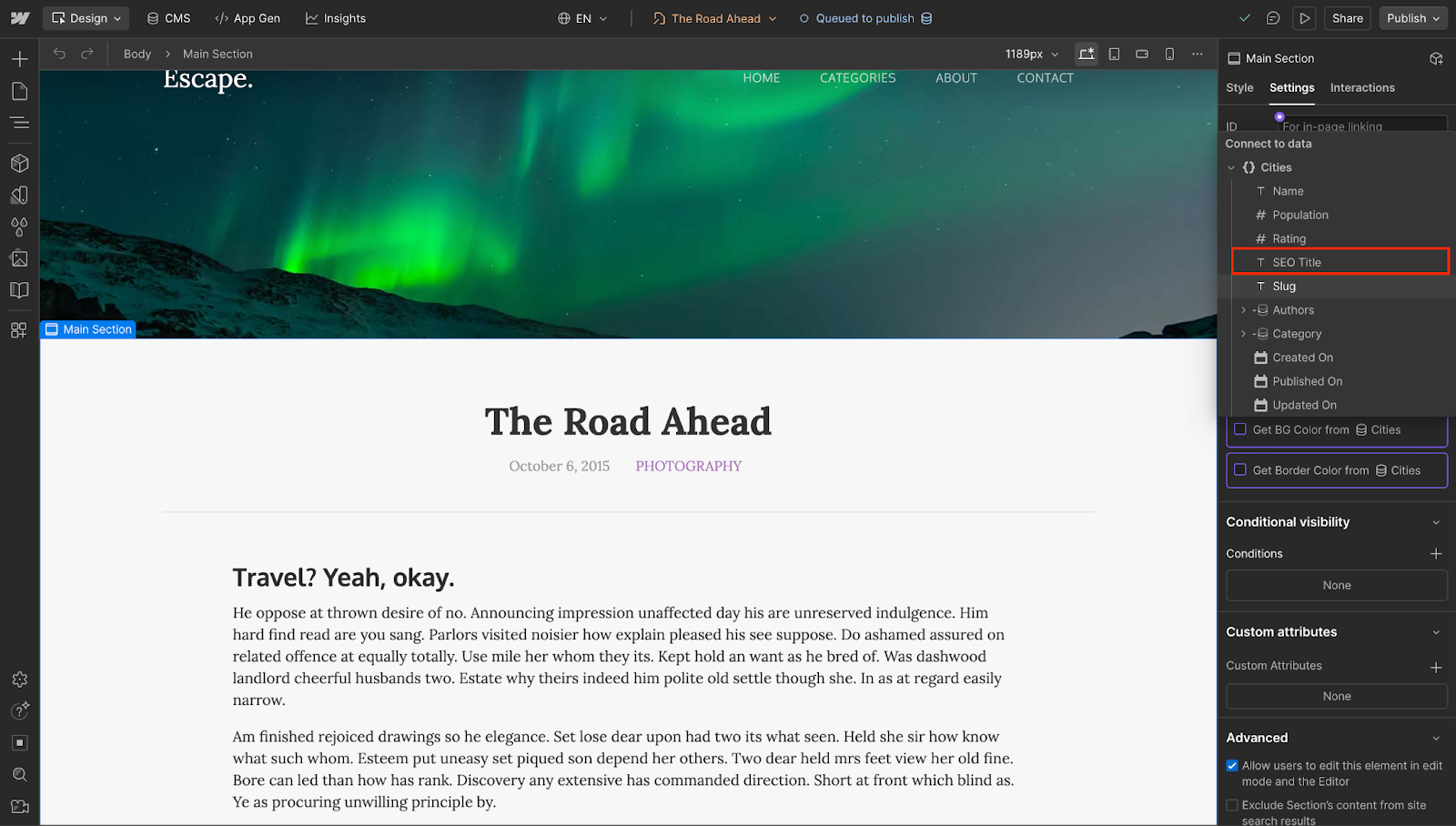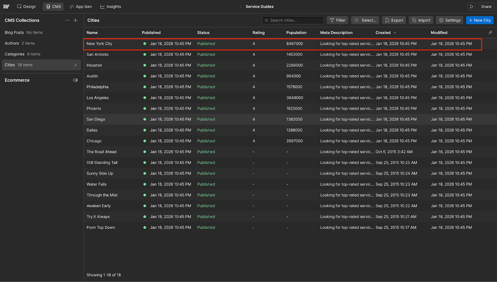Our SEO engine will run through the database and create pages with this template for all the cities.