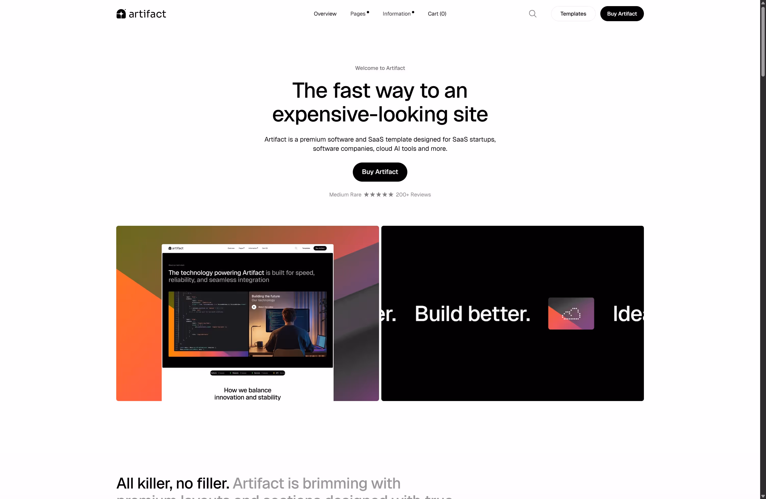 Artifact is a minimalistic SaaS/web app template aimed at AI, fintech, cybersecurity, and cloud startups. Its artful design uses unique background masking and over 60 section layouts:
